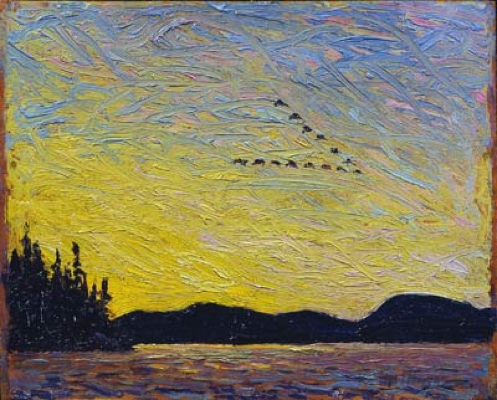 Tom Thomson was a Canadian artist. Between 1912 and 1917 he produced roughly 400 oil sketches on small wood panels and 50 larger works on canvas. His works are landscapes and focus on the trees, rocks, and lakes of Ontario. His art was deeply influential to other Canadian artists. Though he was never a member, he is often considered to be the founder of the iconic “Group of Seven.” Most of his works remain in Canada and many pieces can be seen at the Art Gallery of Ontario in Toronto and the National Gallery of Canada in Ottawa.