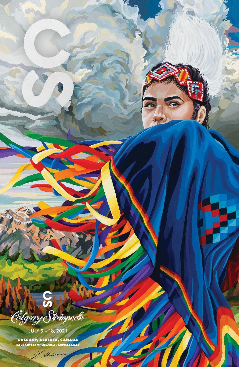Poster for Calgary Stampede 2021 shows Fancy shawl dancer Katari Right Hand with rainbow ribbons trailing from her regalia